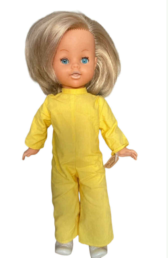 Ce qui distingue la Poupée Bella Liliane année 71/72, ce sont ses habits d’origine, soigneusement préservés pour respecter son histoire unique. Son ensemble vestimentaire est une représentation vibrante de la mode rétro, caractérisée par des matériaux durables et des motifs iconiques propres à son époque. Les habits sont en très bon état, ajoutant une valeur inestimable à cette pièce vintage.