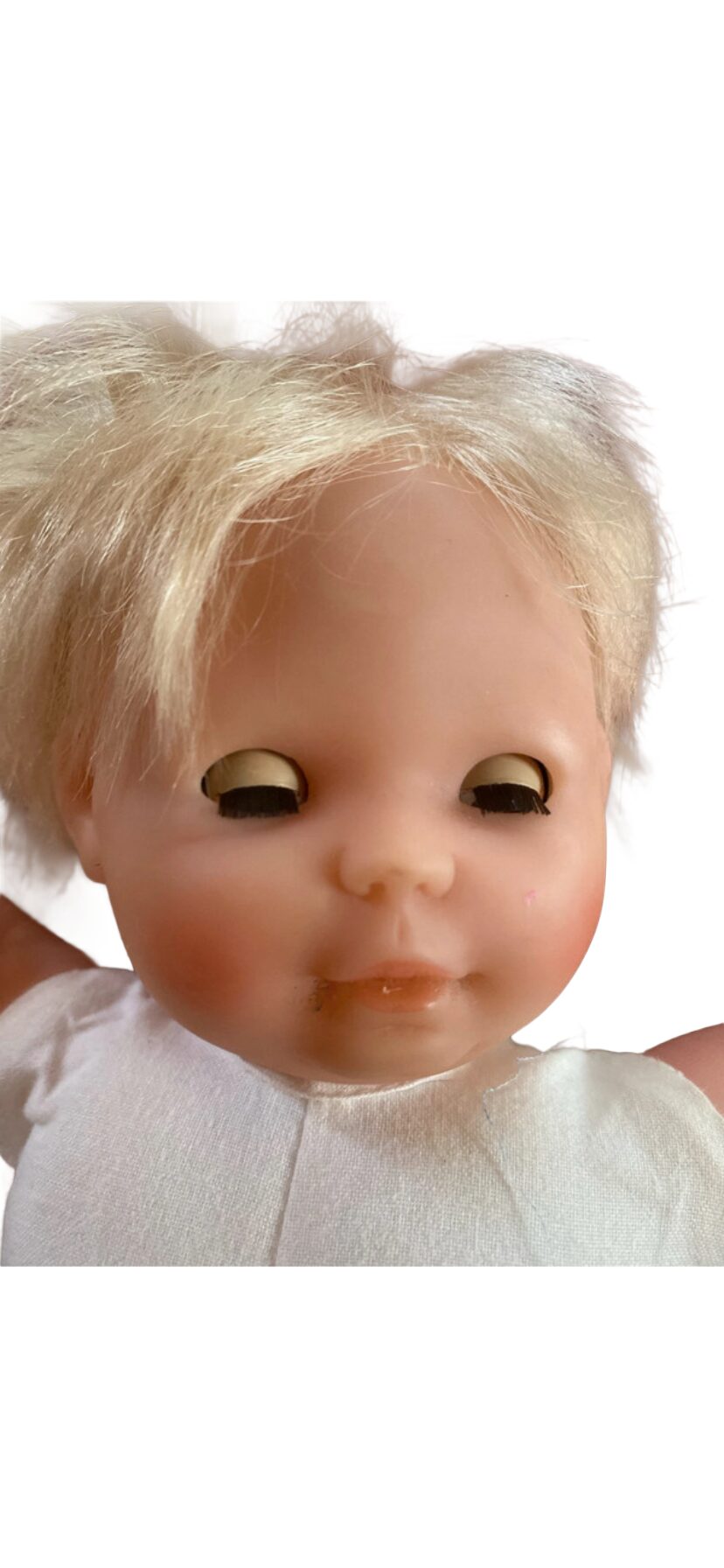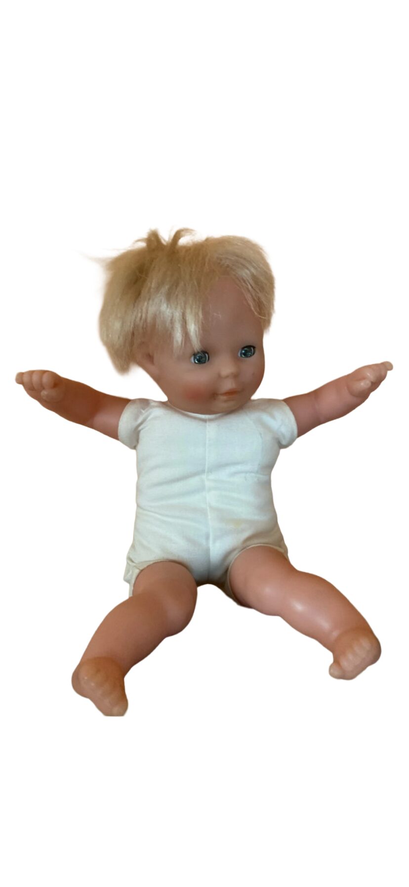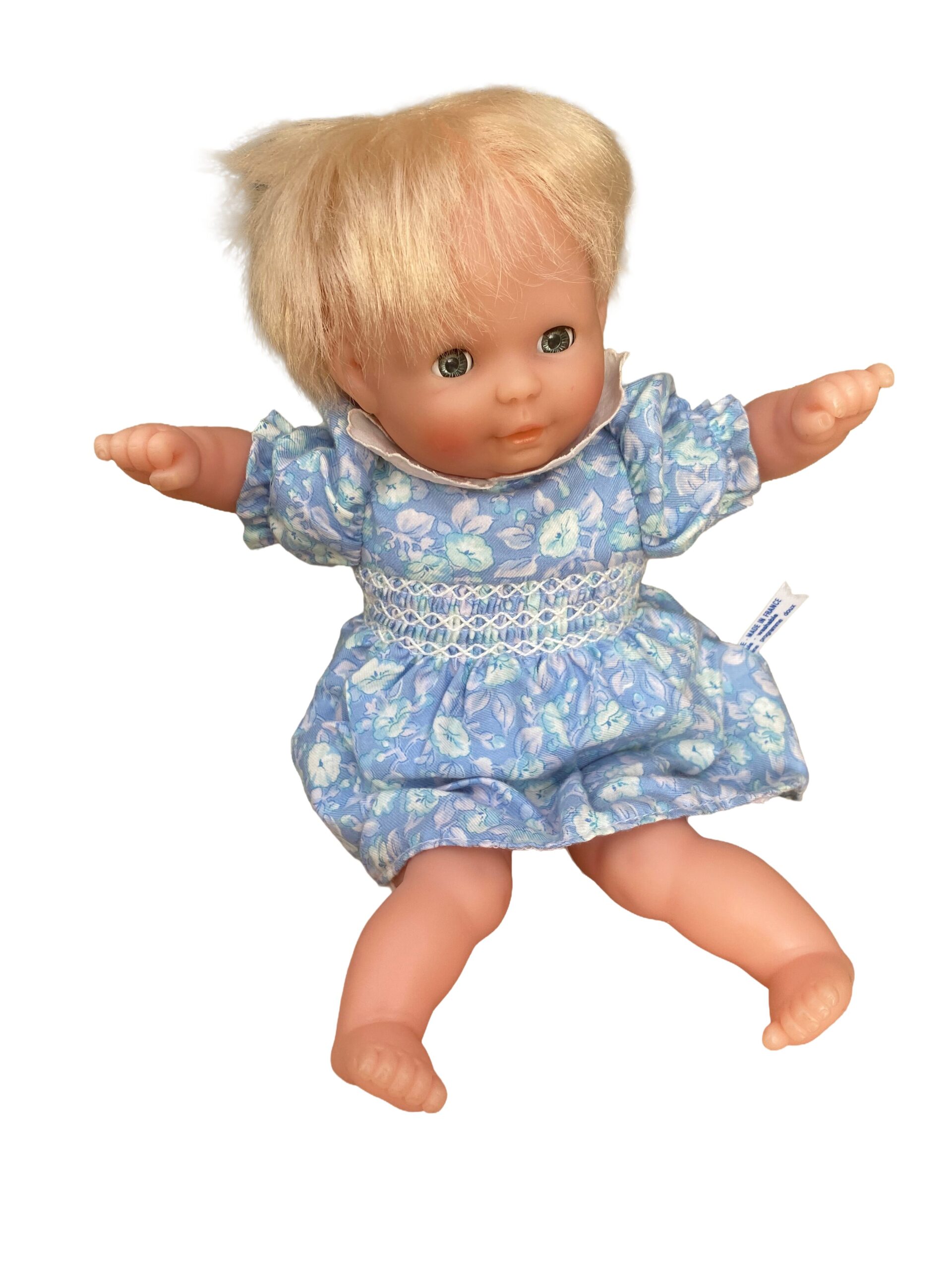 Cette poupée Corolle préserve son charme d’époque grâce à sa robe d’origine, qui ajoute une belle touche rétro à son apparence.