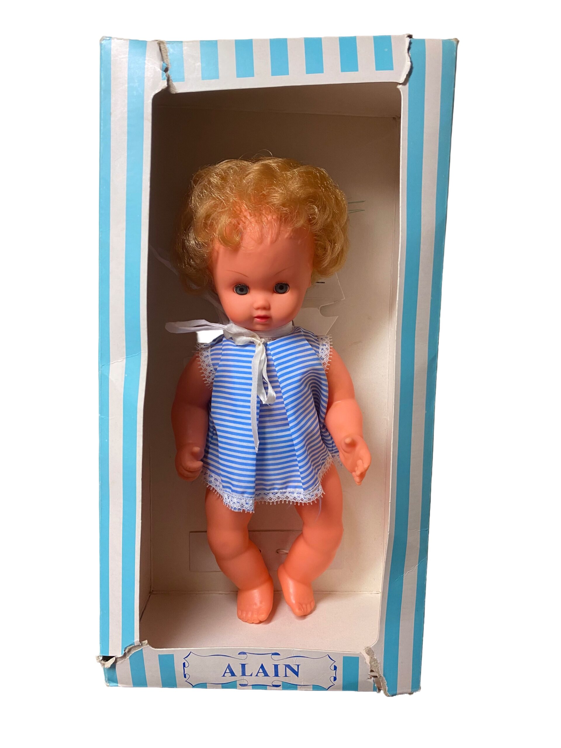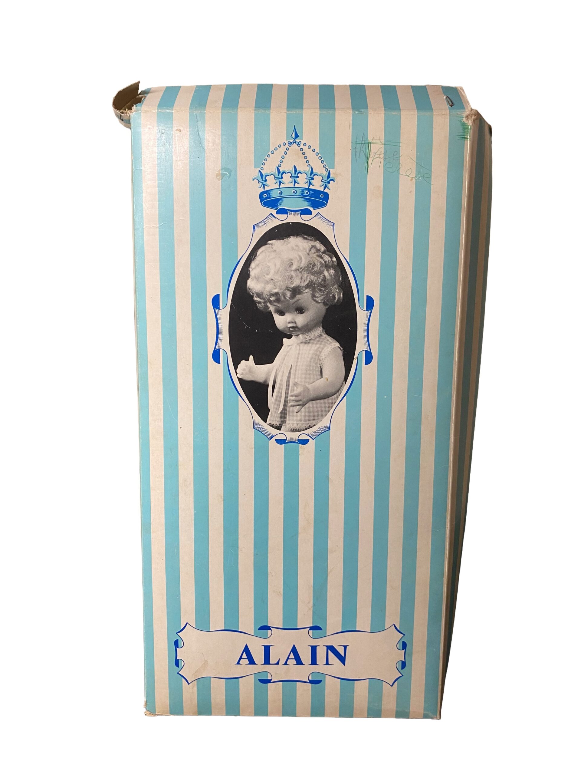 Alain a été conservé dans sa boîte d’origine, ce qui est rare pour les poupées de cet âge. Bien que la boîte soit abîmée, le poupon lui-même est neuf, offrant aux collectionneurs un véritable trésor en excellent état.