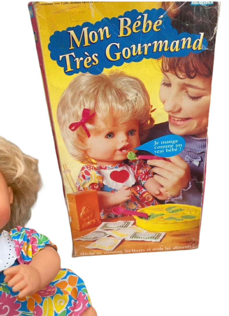 Bien que la poupée elle-même soit en bon état, il est à noter que la boîte d’origine présente quelques traces d’usure. Cette légère imperfection de l’emballage n’enlève rien à la valeur de la poupée et ajoute une touche d’authenticité à son charme vintage. Pour les collectionneurs en quête d’une pièce originale et pleine de caractère, cette poupée Mon Bébé Gourmand ne manquera pas de se démarquer.