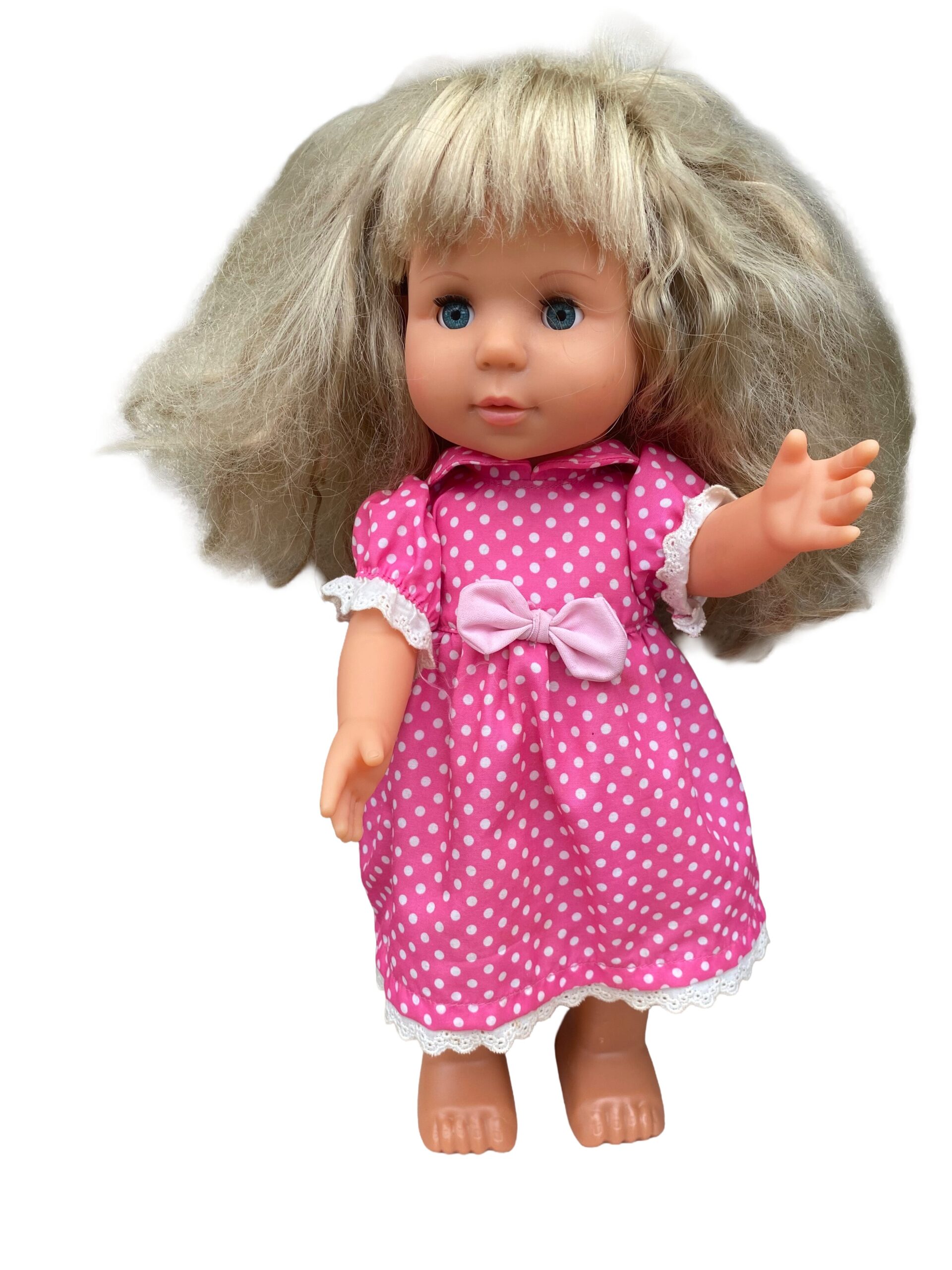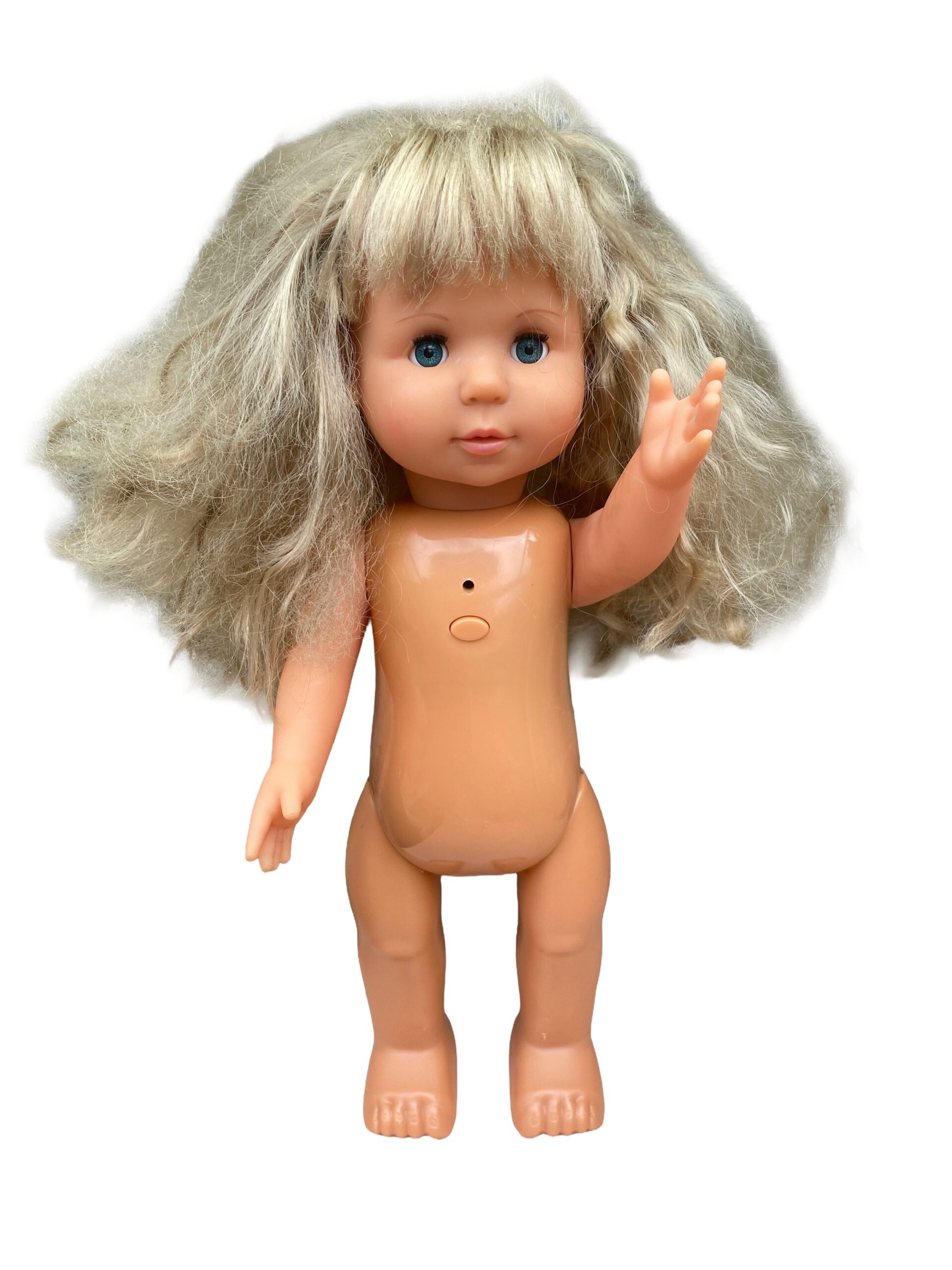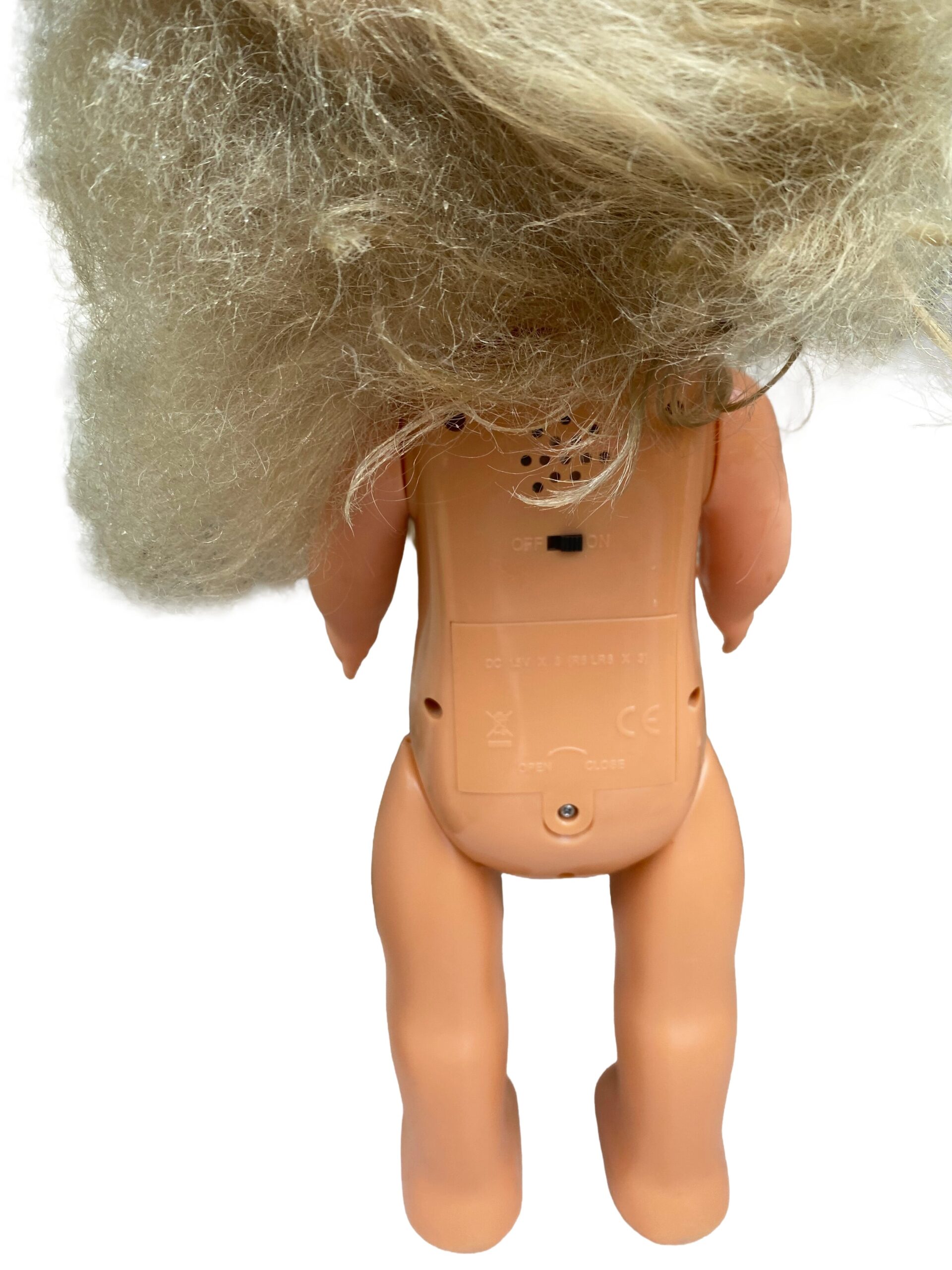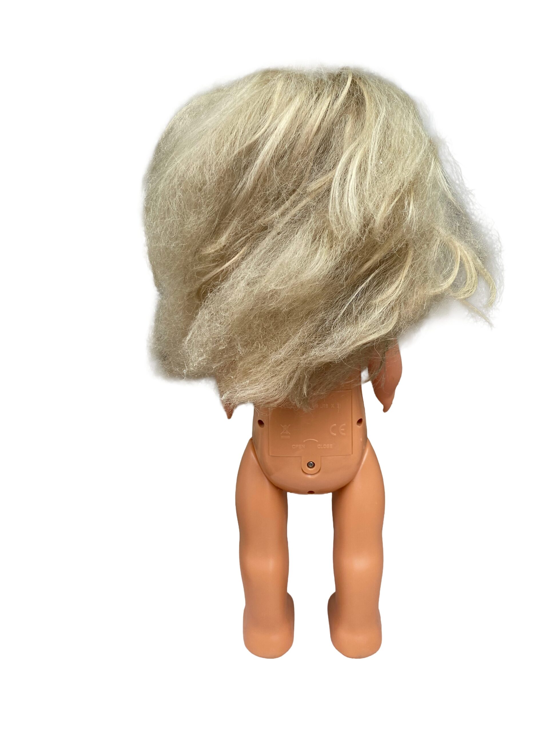 Cette poupée Bayer fonctionne en chantant et en marchant, ce qui en fait un modèle ludique et interactif. Elle mesure 40 cm et date de l’année 2000, représentant une belle pièce de transition entre poupée vintage et poupée moderne.