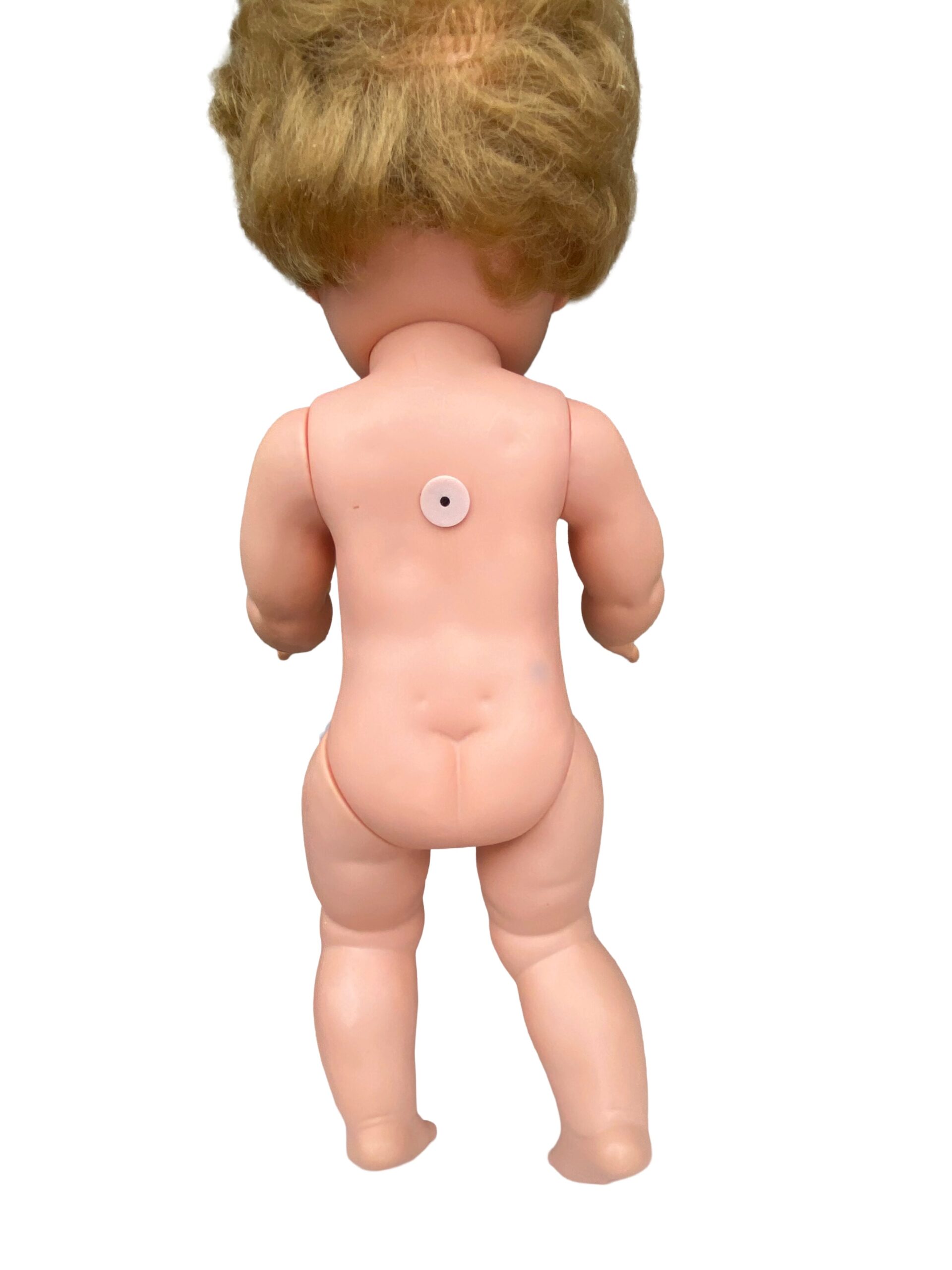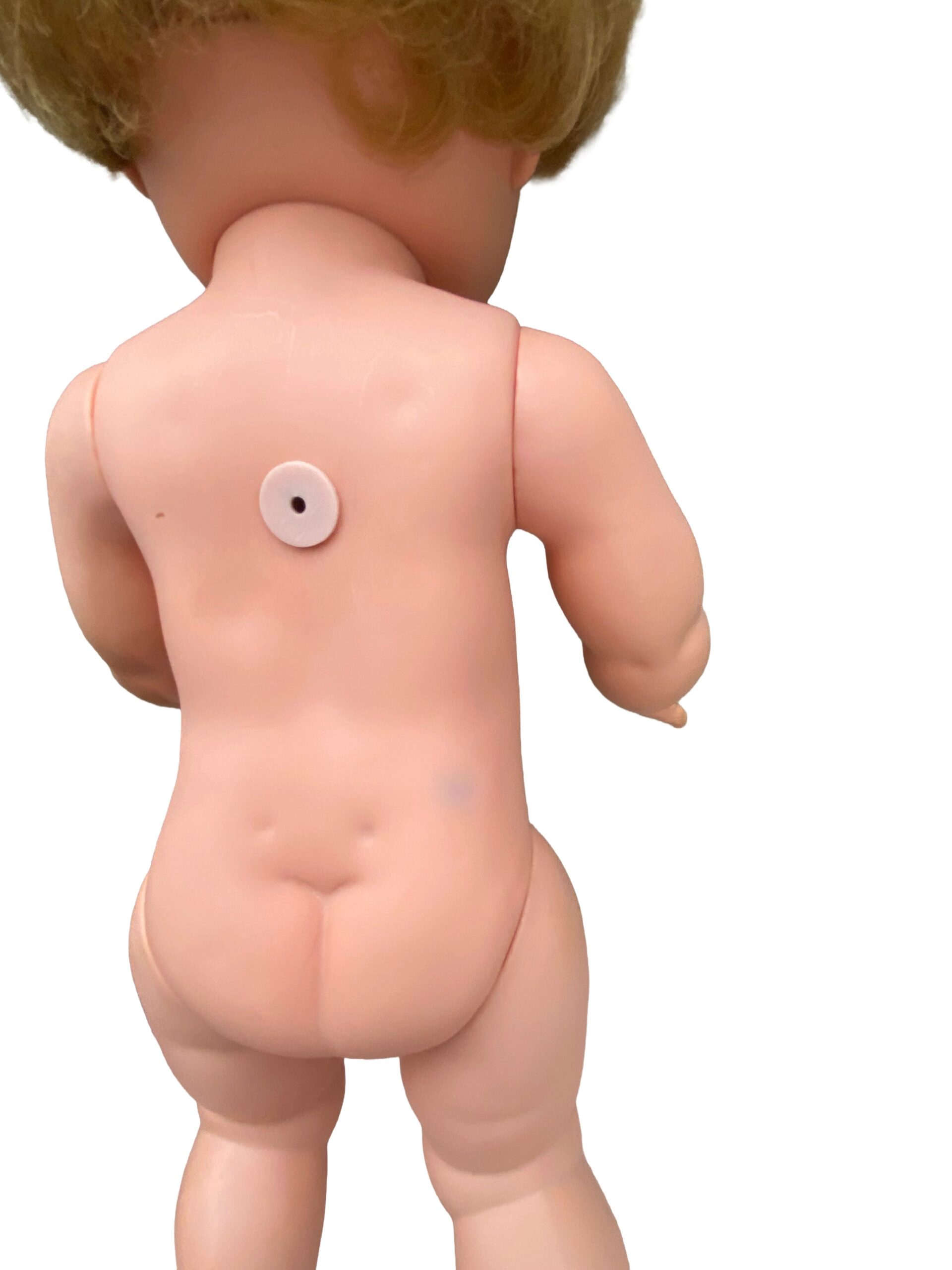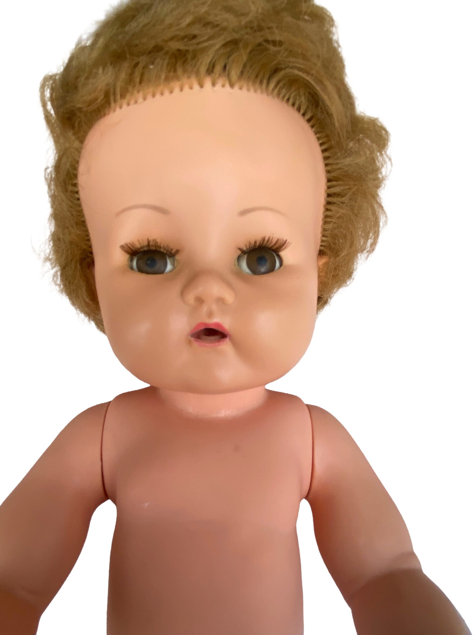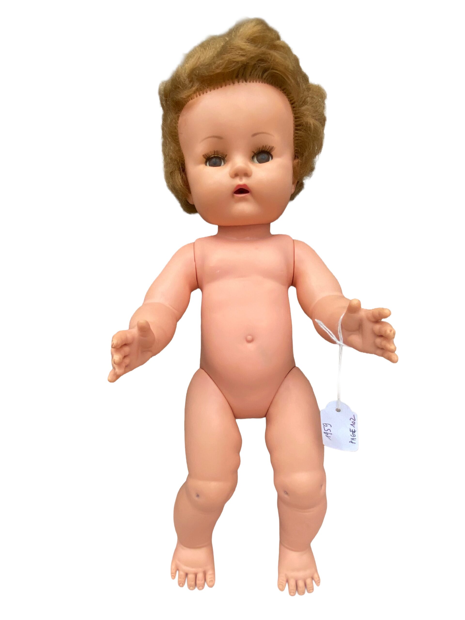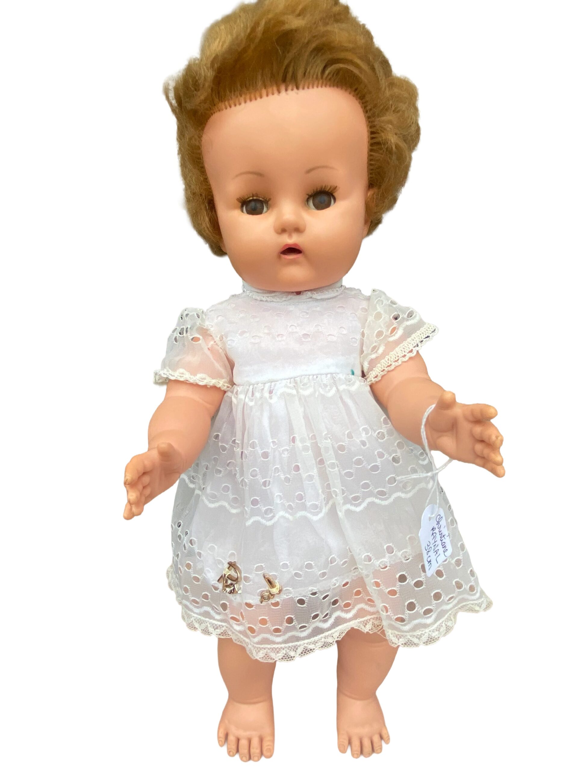 Bien que cette poupée ait traversé les décennies, elle conserve sa beauté authentique. Une légère trace de crayon est présente côté dos, mais elle reste discrète et n’enlève rien à son charme unique.
